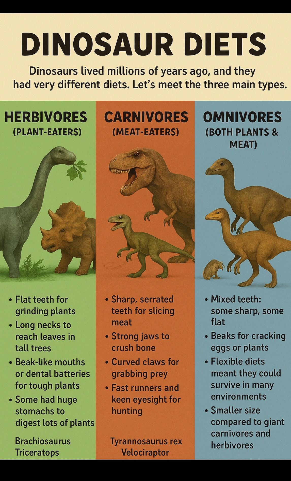 Dinosaurs had lots of different diets. Some were herbivores, munching on plants and leaves. Others were carnivores, hunting meat to eat. And some were omnivores, enjoying a mix of both. Check out the chart below to see what each dinosaur liked to eat.